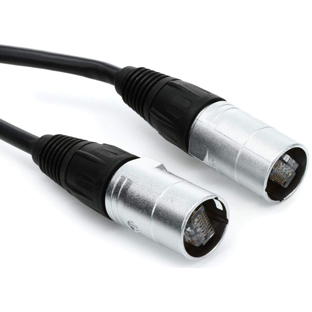 This cable uses a Cat 5e Ethernet design with Ethercon connectors to support secure connections in demanding applications. The shielded construction is intended to reduce interference in electrically noisy environments. Solid conductor cabling is used to maintain consistent signal performance over extended cable runs.