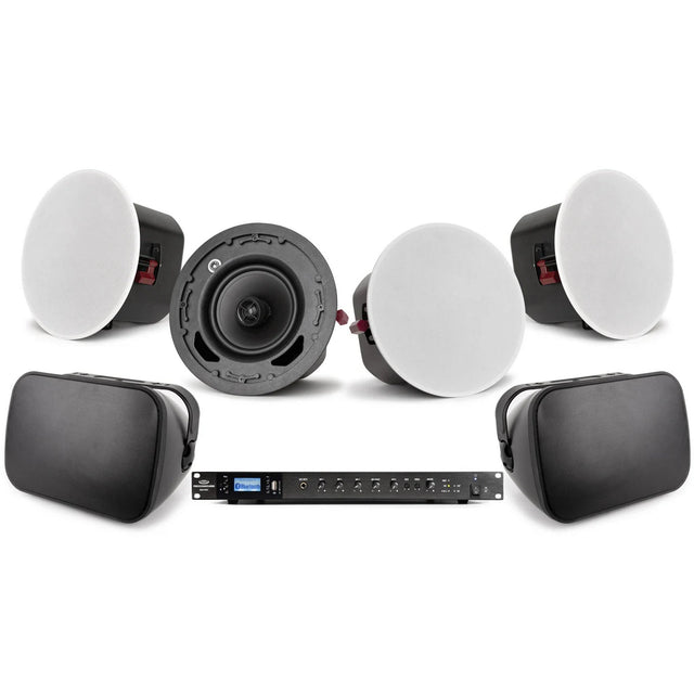 This Pure Resonance Audio commercial sound system delivers powerful and clear sound coverage for both indoor and outdoor business environments. Combining durable weather-resistant surface mount speakers and premium in-ceiling loudspeakers with a high-power Bluetooth mixer amplifier, it provides excellent foreground and background audio performance for restaurants, retail stores, fitness centers, and hospitality spaces.