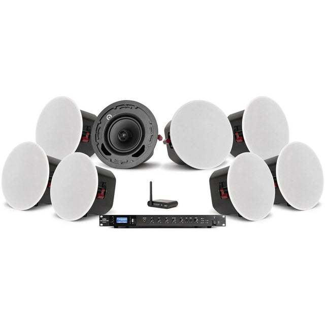This Pure Resonance Audio Office Sound System delivers professional-grade background music and paging performance for corporate buildings, call centers, and commercial workspaces. The system combines eight high-performance 6.5-inch 2-way 70-volt ceiling speakers with a powerful 350-watt rackmount mixer amplifier and a long-range Bluetooth receiver for up to 100 feet of wireless streaming.