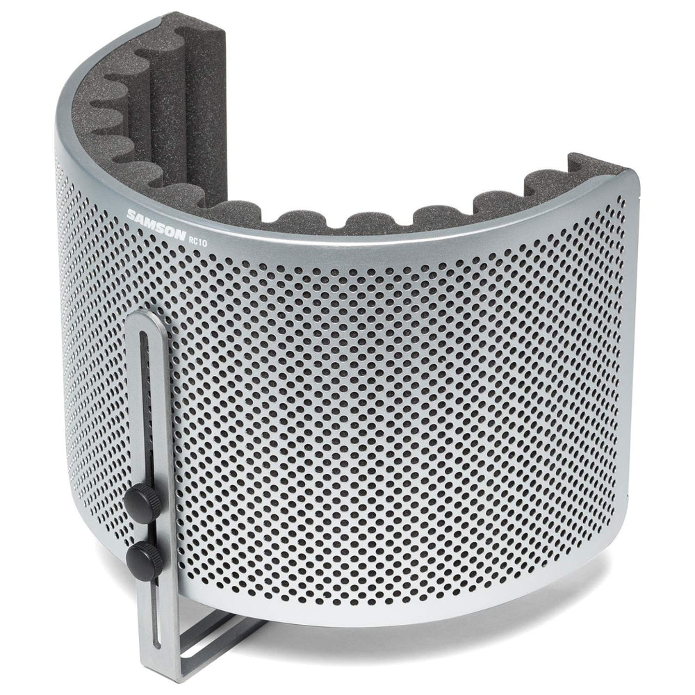 The Samson RC10 Reflection Filter works with your microphone to transform any home or studio recording space into a professional vocal booth. Featuring single-panel construction with an industry standard acoustic foam interior and aluminum framing, the RC10 rejects unwanted room noise and off-axis reflections, resulting in clear, crisp recordings. Primarily used for vocals, the RC10 is extremely versatile and can benefit recording situations that involve guitars, drums and other instruments. The lightweight RC10 is extremely portable, allowing you to capture great recordings anywhere, as well as adjustable, with its steel mounting mechanism offering up to 6.5” of vertical reach. The included mounting hardware easily attaches to standard mic clips (top threading) and stands (bottom threading), which also allows for up to 8.75” of forward/backward movement for optimal placement.