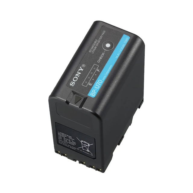 The lithium-ion battery Sony BPU70 72 Wh Lithium Ion Battery boasts a capacity of 72 Wh, providing a perfect equilibrium between capacity and weight for various professional video uses.