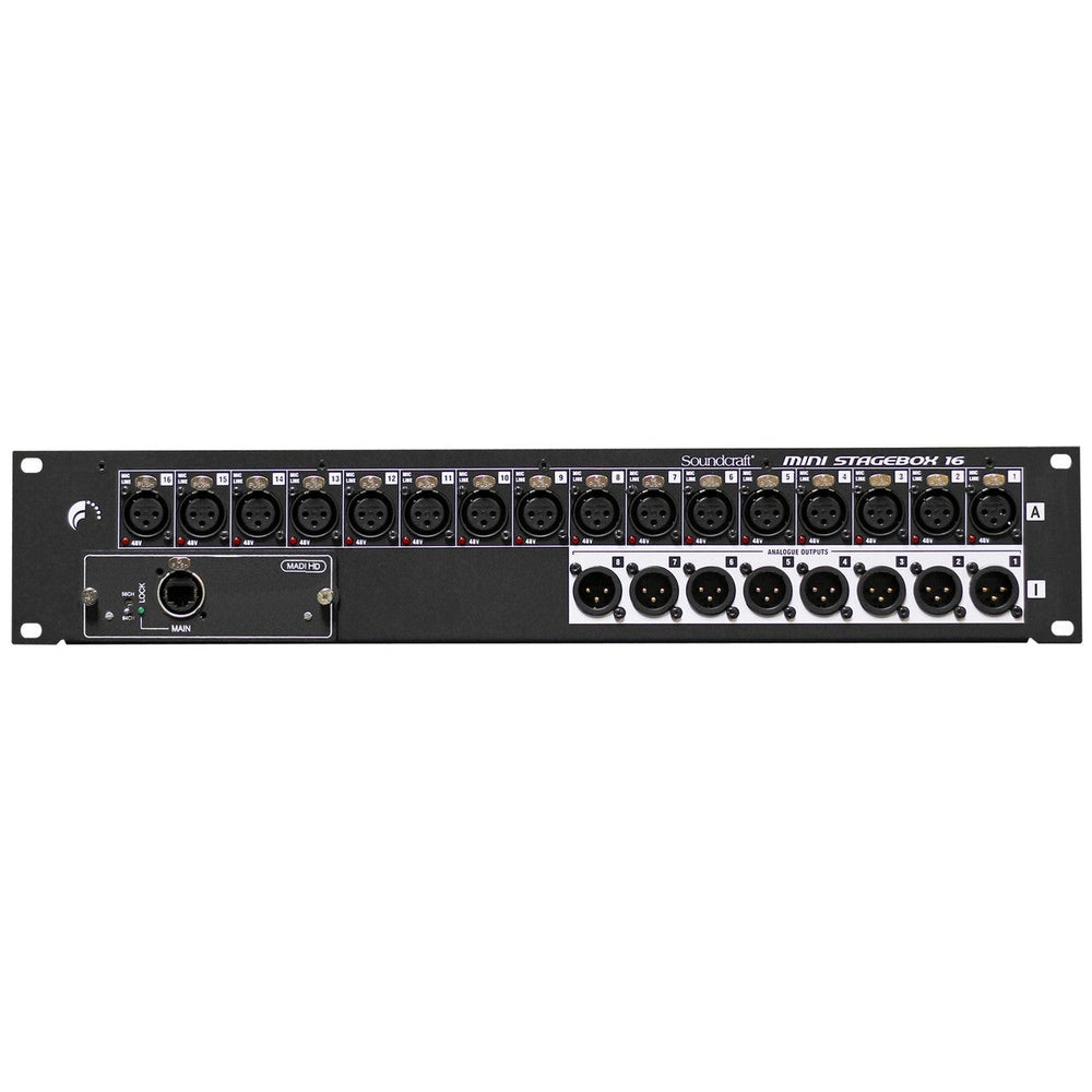 - The Soundcraft Mini Stagebox 16 requires only 2U of rack space and, in this tiny footprint, provides 16 recallable mic/line inputs and 8 balanced line outputs, all lifted directly from the Vi1 and the larger Compact Stagebox.