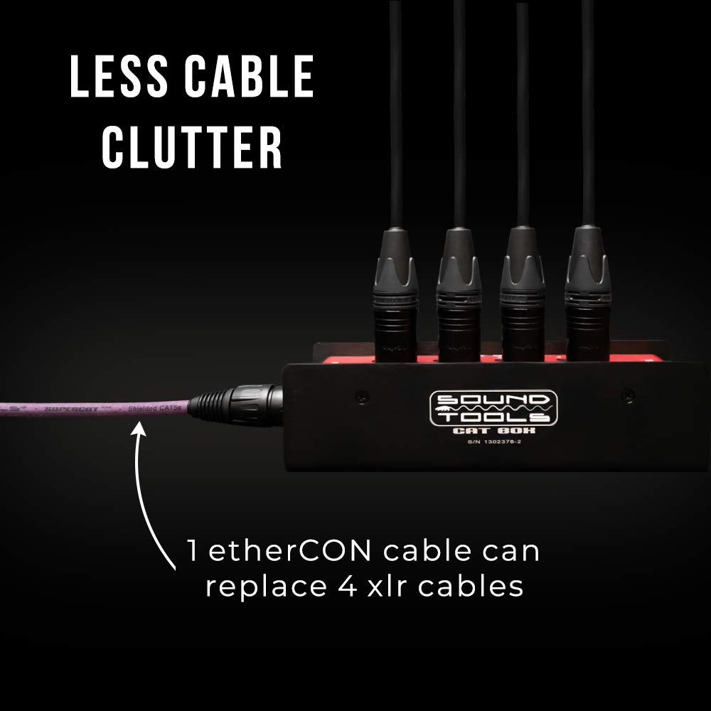 Perfect your stage snake system with the compact and durable SoundTools CAT Box. Minimize the number of cables required by running up to four channels of audio and data from XLR, DMX, or AES3 lines through a single shielded CAT line. Designed by sound humans to look great and function for a lifetime. The disconnectable CAT Box stage boxes can be daisy-chained and used in multiple configurations to build the perfect snake. The SoundTools CAT Box isn’t your average stage drop box. We’ve designed it to be one of the most versatile audio-over-Cat units on the market. When combined with our SuperCAT or SuperCAT Sound cables, a snake built with CAT Boxes will cost approximately 15% what you’ll pay for an average audio snake using 4 XLR cables. Now you can run four isolated channels of clear audio or com down a single shielded Cat5e or better cable, and even increase the distance of your lines. We’ve successfully run balanced analog over 600 feet with our SuperCAT cable in our workshop.