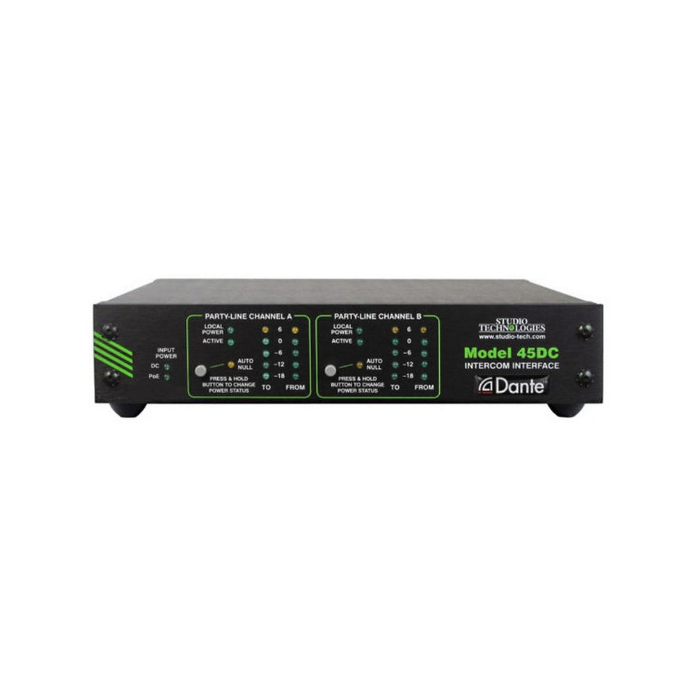 The StudioTechnologies Model 45DC Dante to Dual Party-Line Intercom Interface is designed for applications that utilize single-channel analog party-line (PL) intercom technology. The unit provides two independent single-channel interfaces that each support one party-line audio channel. Single-channel party-line intercom systems are commonly used in theater, entertainment, and education applications where a simple, reliable, low-cost, and easy to use solution is desired. Analog party-line products from Clear-Com are directly compatible with the Model 45DC. The Dante audio-over-Ethernet media networking technology is used to transport the send and receive audio channels associated with each of the two party-line circuits. Two hybrid circuits with automatic nulling provide excellent audio quality and high return-loss. (These hybrid circuits are sometimes referred to as 2-wire to 4-wire converters.) The Model 45DC is directly compatible with the latest broadcast and audio equipment that uses Dante technology. An Ethernet connection is all that's required to make the Model 45DC part of a sophisticated, networked audio system.