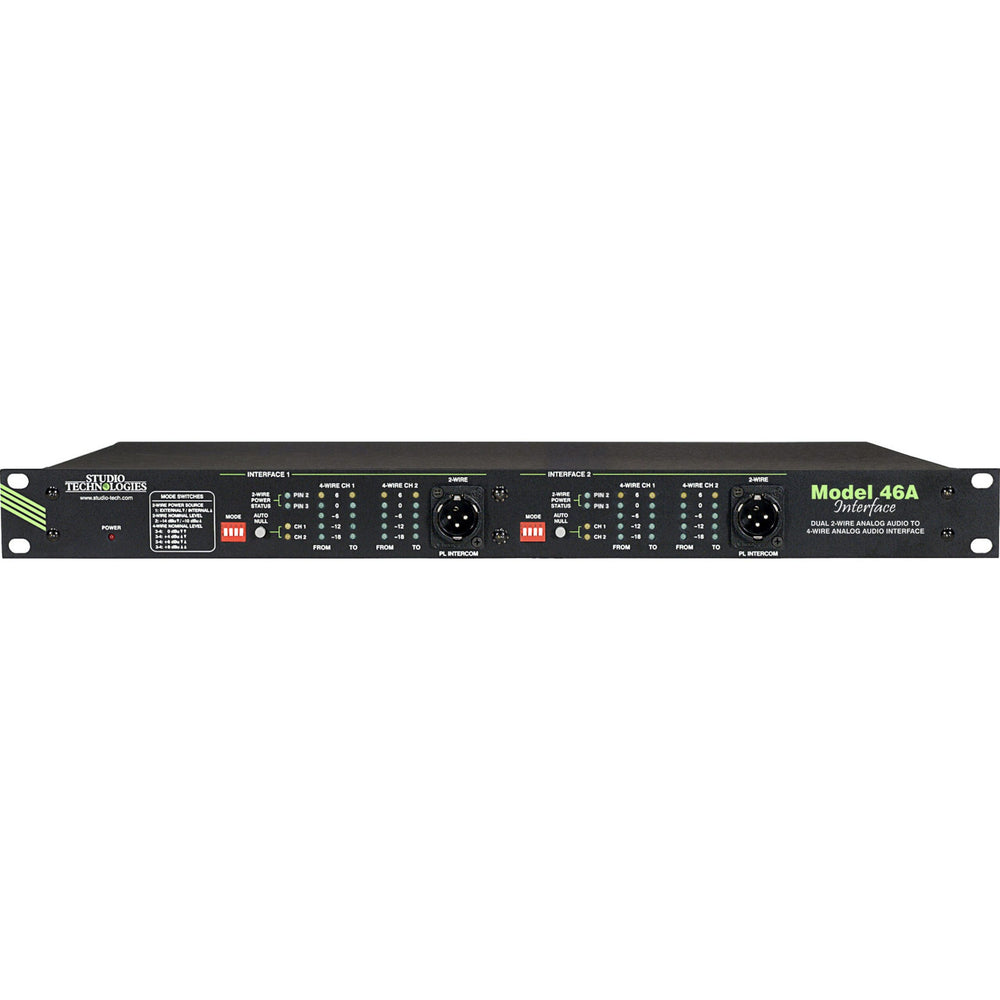 The Studio-Tech Model 46A is designed to interface 2-wire full-duplex party-line (PL) intercom circuits with 4-wire audio circuits associated with matrix intercom systems. Other specialized audio system interfacing applications can also be supported. The Model 46A provides two independent full-featured 2-channel interfaces. Each interface contains two hybrid circuits which include automatic nulling capability.