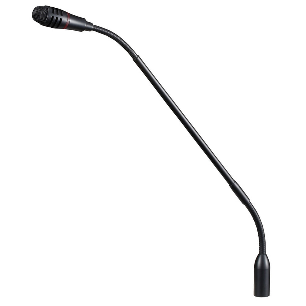 The TS-923 Microphone is a dedicated component of the Infrared Conference System's Chairman unit and Delegate unit. Its mic head is equipped with an illuminated display ring that allows the status of the units in use to be monitored at a glance. Its gooseneck has two flexible parts, making it possible to adjust the microphone to an optimal position for the user.