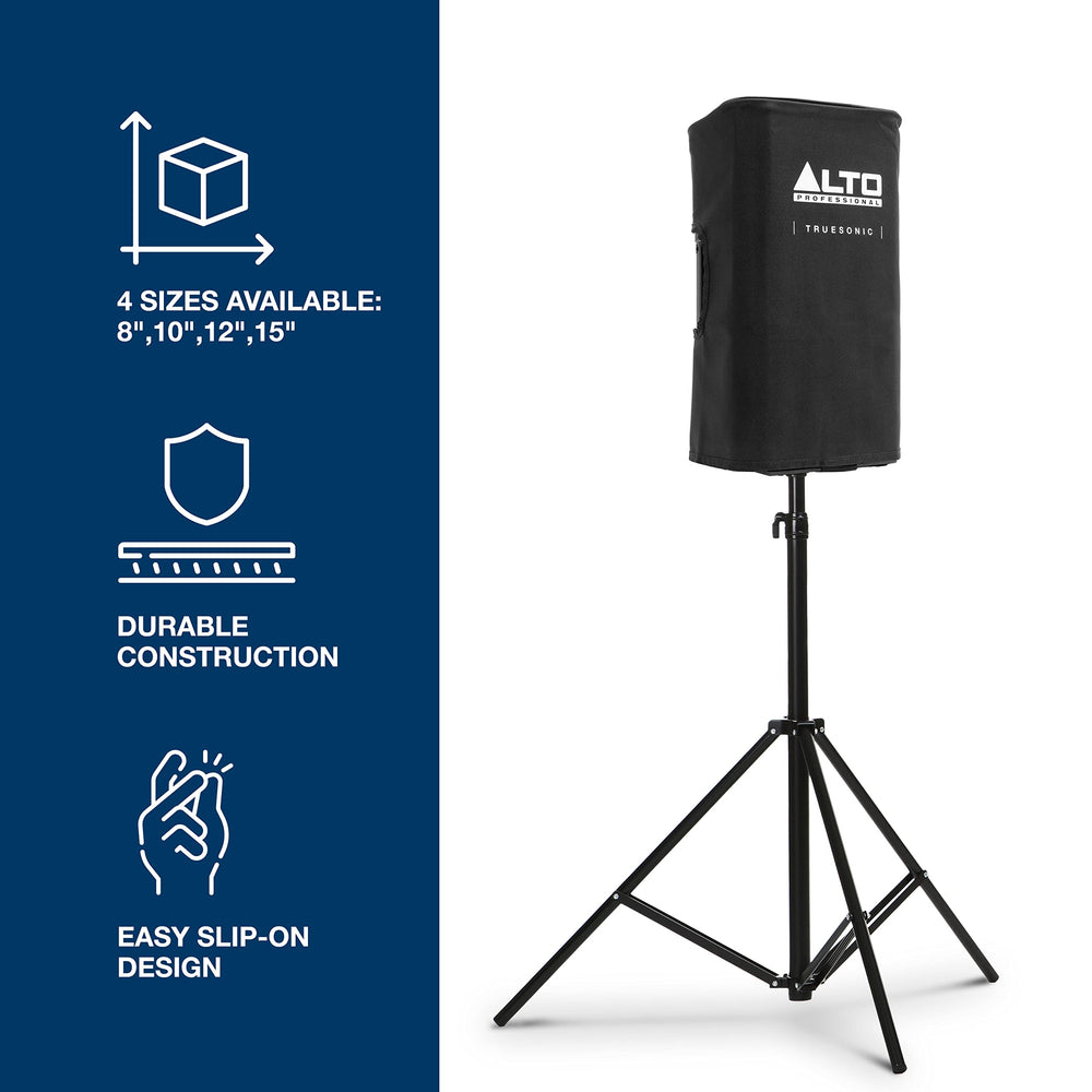 Protect your investment! These durable covers defend TRUESONIC TS4 speakers from the inevitable bumps, scratches, spills and dents that can arise from constant transport. This fitted speaker cover is tailored specifically for the TS408. Made of water-resistant material, It'slips on easily over the top of the speaker, and thanks to the bottom strap It'stays in place regardless of orientation, making it ideal for wIt'standing the rigors of the road. Cut-outs give you fast access to the speaker handles, so It's easy to carry while It'stays protected.