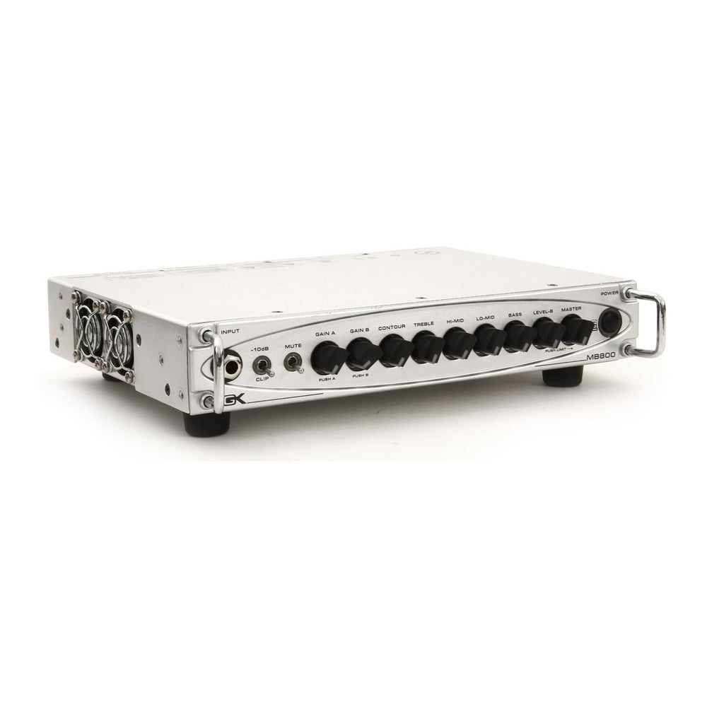 About that pro functionality: GK's fitted this little beast with everything you need. The MB800's controls are illuminated to indicate operating status: input clip, tuning mute, Gain A, Gain B/Level-B, power amp clipping, limiter enable and EQ/Contour settings. Every stage of the MB800's discrete FET driven preamp features the same FET technology used to create the proprietary Boost circuit found in all GK amps. (That's GK's Gate Induced Valve Effect - G.I.V.E. for short.) Driving the MB800's 4-band active EQ, Contour, and Gain with FET devices allows the MB800 to migrate seamlessly from warm and clean, to a full-on growl with major attitude.
