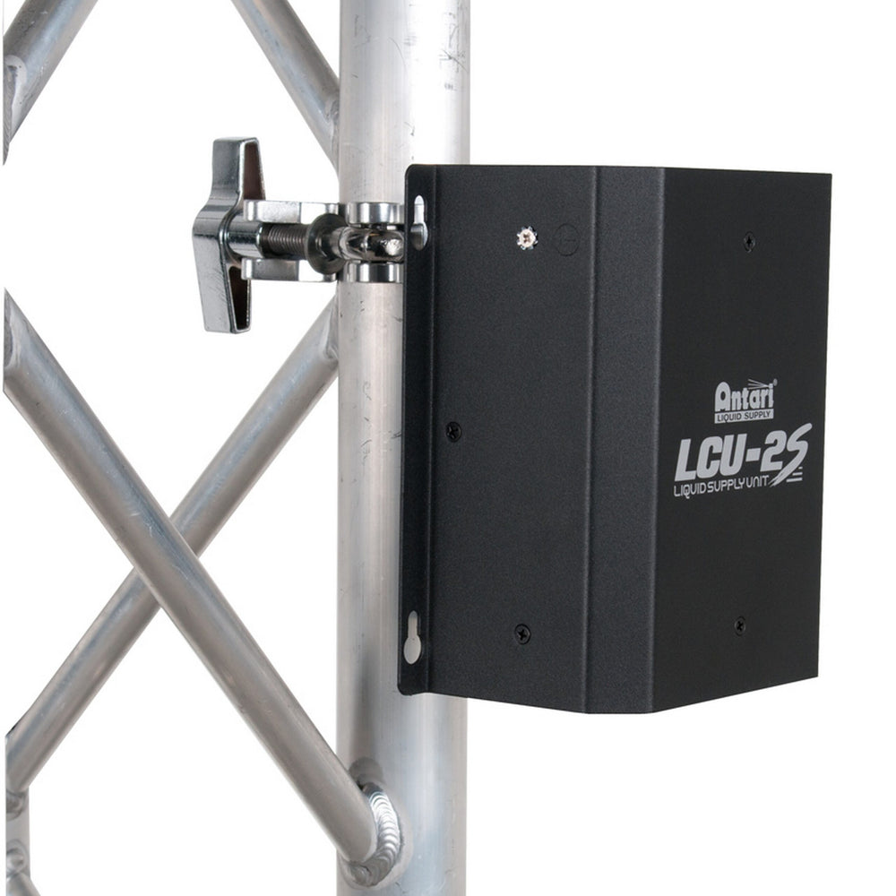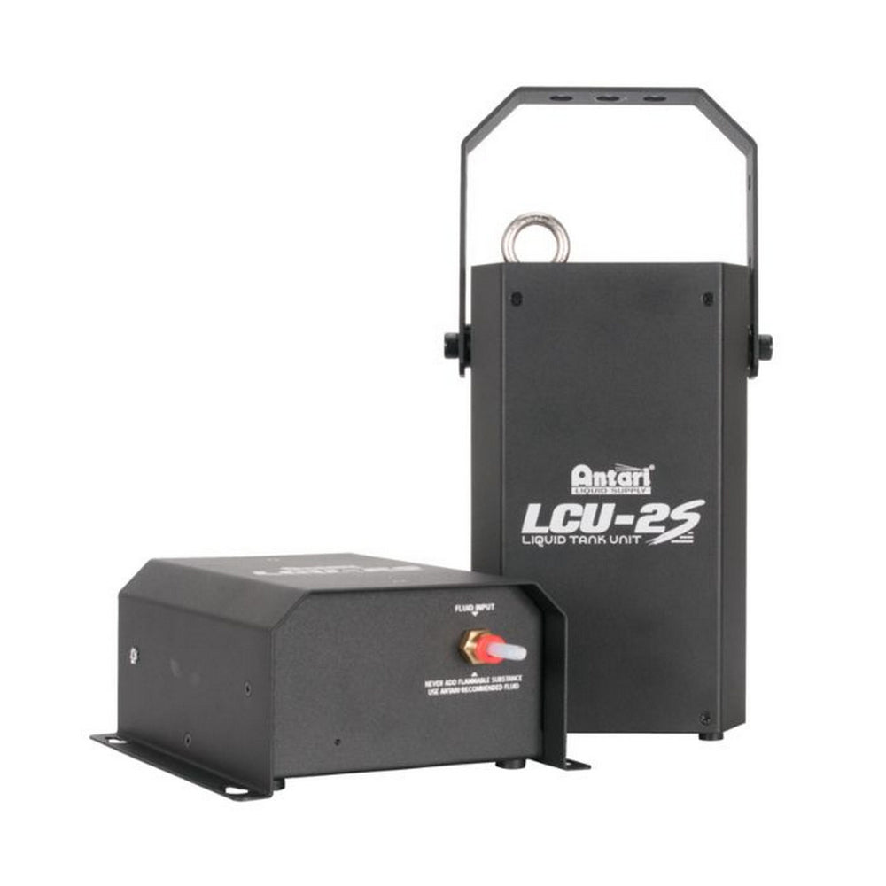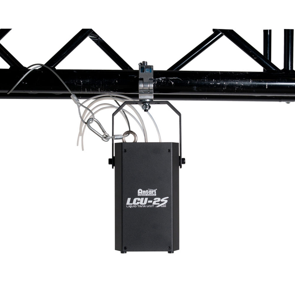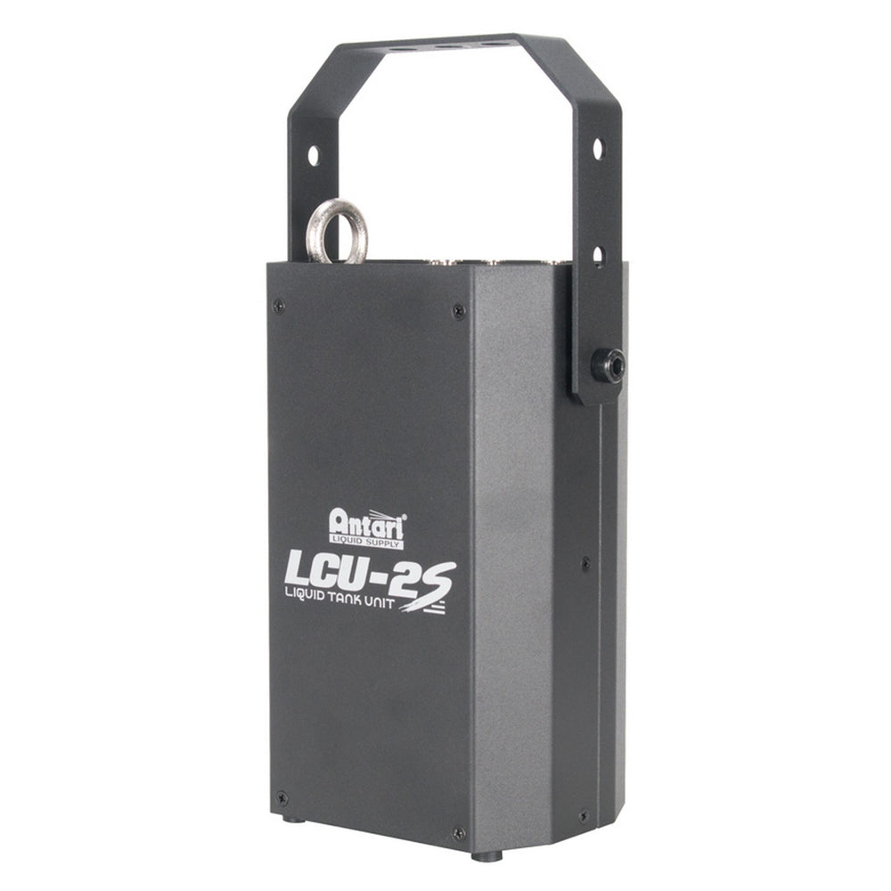 The Antari LCU-2S Liquid Control System is a universal effect liquid delivery system for all high volume usage Antari fogger, fazer, and snow machine installations. The system can supply up to 3 different Antari effect machines which use the same type of effect liquid. The system features a separate Liquid Supply Unit with 3 4mm liquid tube outputs, 1 6mm liquid tube input, 3pin data control input, an adjustable yoke bracket and safety cable loop for clamp/truss mounting, and a separate Liquid Tank Unit with 1 6mm liquid tube output, 1 3pin data control output, and a main power switch. The system also includes 1 3pin data connection cable, 1 6mm fluid tube, 1 4mm fluid tube, 3 4mm-4mm adaptors, 3 6mm-4mm adaptors, a fluid filter, and power cord.