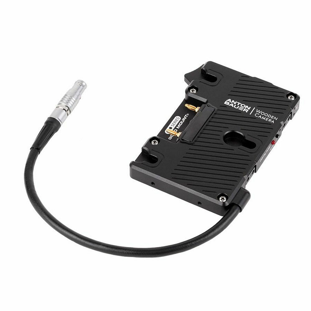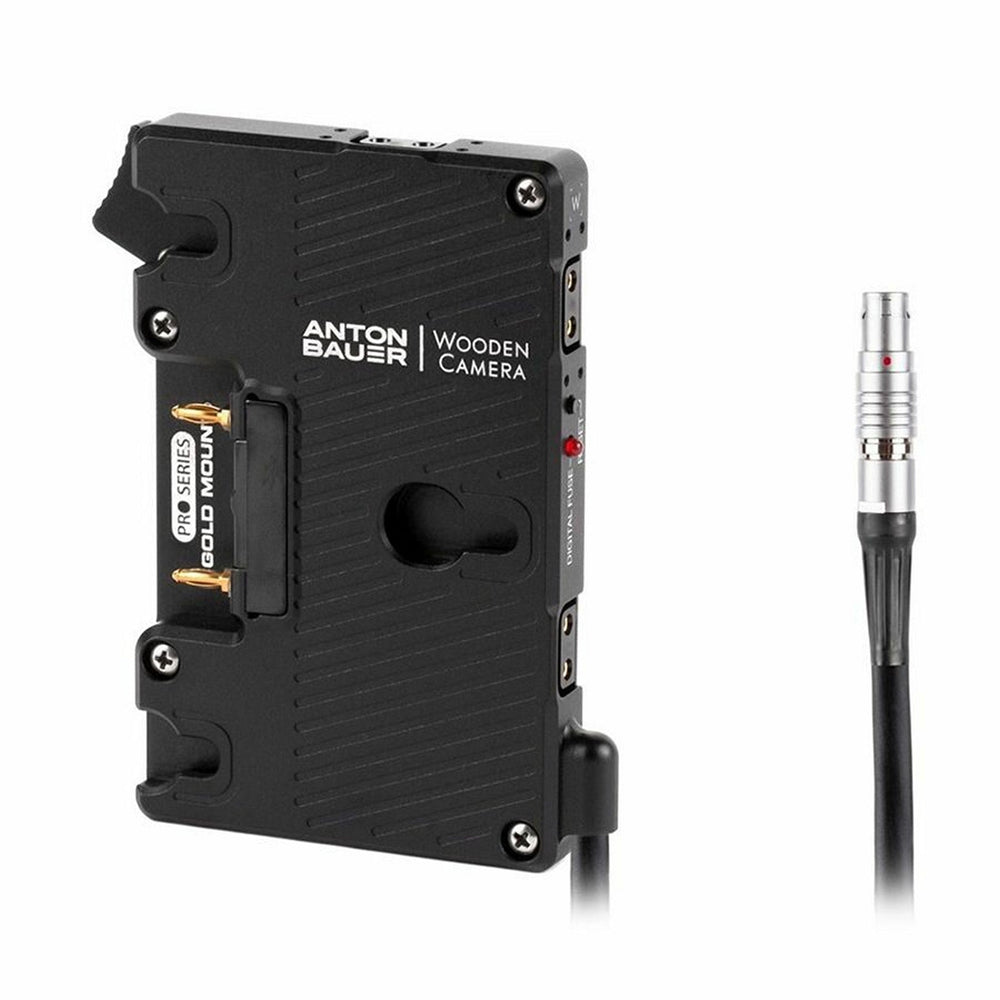 Pro Gold Mount (RED DSMC1/DSMC2)) with a rugged aluminum body for durability and secure battery mounting and a RED DSMC1/DSMC2 LEMO compatible connector. Features 3x P-Taps for accessory power at battery voltage (12-16V), a digital fuse with reset button, rear cover plate, and captive mounting screws. Should the user exceed the set current for accessories, only the accessory outputs are disabled leaving the camera running normally. Once the current load has been reduced by either removing accessories or reconfiguring, the reset button can be pressed to enable accessory power again. 8” cable exits the right side of the plate allowing easy insertion into the camera.