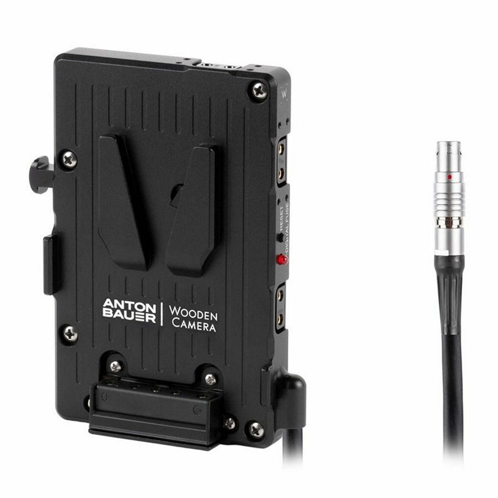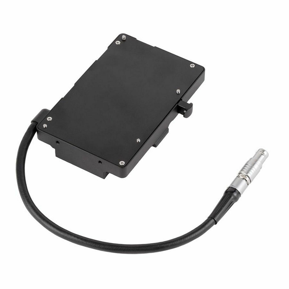 Pro V-Mount (RED DSMC1/DSMC2)) with a rugged aluminum body for durability and secure battery mounting and a RED DSMC1/DSMC2 LEMO compatible connector. Features 3x P-Taps for accessory power at battery voltage (12-16V), a digital fuse with reset button, rear cover plate, and captive mounting screws. Should the user exceed the set current for accessories, only the accessory outputs are disabled leaving the camera running normally. Once the current load has been reduced by either removing accessories or reconfiguring, the reset button can be pressed to enable accessory power again. 8” cable exits the right side of the plate allowing easy insertion into the camera.
