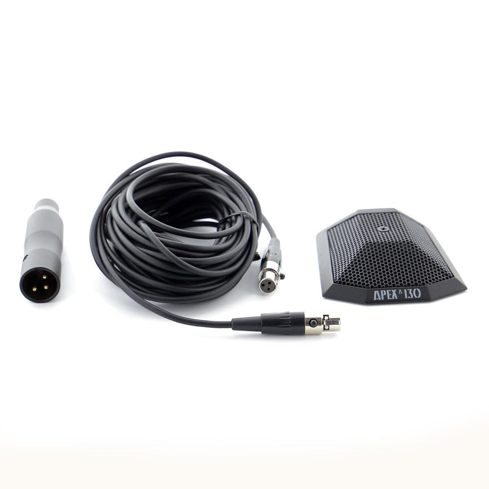 The Apex130 is a low profile condenser boundary microphone designed for conference rooms, council chambers, church pulpits or lecterns. The distinct advantage of the Apex130 is apparent when mounted on a large flat surface. Direct and reflected sound arrive at the diaphragm in phase. This means that the directionality of the microphone is increased, the user sees more gain before feedback and increased suppression of unwanted ambient noise.