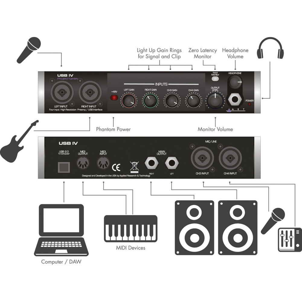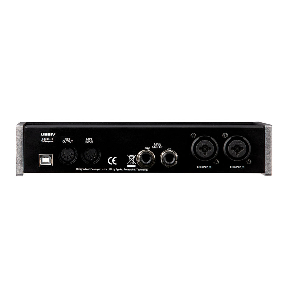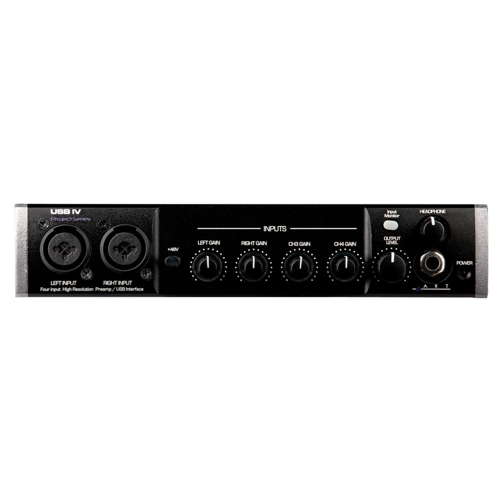 The ART USB IV is a high-performance USB audio and MIDI interface offering 32-bit conversion and sampling rates up to 192 kHz. It provides four combo XLR / 1/4" inputs with low-noise preamps (two with Hi-Z support), plus two balanced main outputs and a dedicated headphone monitor. With full MIDI I/O, direct input monitoring, transformer-isolated outputs, and USB bus power, it is ideal for project studios, mobile rigs, and home recording setups.