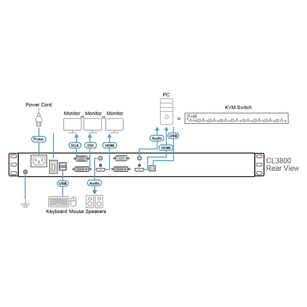 The CL3800 USB HDMI DVI VGA LCD Console is a short depth dual rail LCD KVM console featuring an 18.5" LED-backlit widescreen LCD monitor with an integrated keyboard and touchpad. The short-depth design fits all 19" equipment cabinets, and is especially suitable for shallow racks. In addition to saving valuable space on the rack, the CL3800 also provides a space-saving solution for special environments, such as outside broadcast vans (OB vans) and compact control rooms. The CL3800 supports three types of video input - HDMI, DVI, and VGA - and provides the ultimate in installation flexibility by allowing users to connect the console and the computer via any of the three types of video source. The CL3800NWās full HD widescreen LCD monitor ensures excellent video quality and provides ample viewing area.