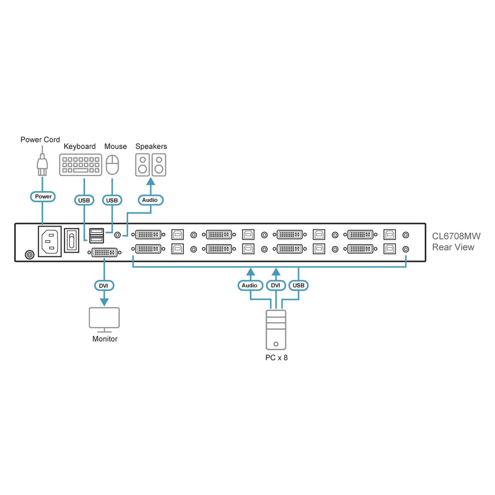 The CL6708MW brings additional versatility to ATEN’s line of LCD KVM Switches with its native DVI compatibility. Building on ATEN’s renowned, space-saving approach to KVM switches - which integrates an LCD panel, full keyboard, and touchpad into a streamlined, 1U housing - the CL6708MW is a highly-scalable LCD KVM switch which features the ability to control up to 64 computers by cascading 8 additional CS1768 8-port KVM switches.