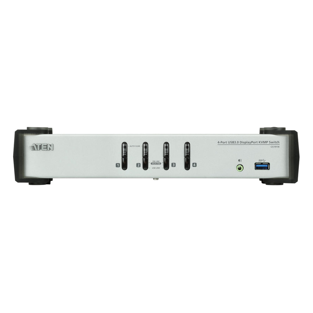 The ATEN CS1914 4-Port USB 3.0 DisplayPort KVMP Switch provides the latest innovations in desktop KVM switching technology to meet the increasing demand of higher video quality and file transfer rates on modern computers. The CS1914 provides superior resolutions up to 3840 x 2160 @ 30 Hz, a SuperSpeed USB 3.1 Gen 1 hub with 5 Gbps transfer rates and enhanced user-friendly operations.