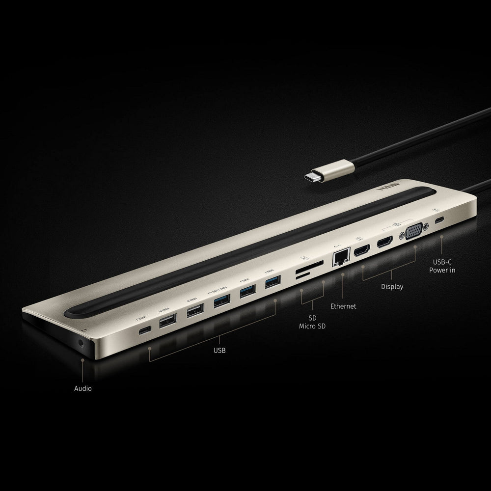 The ultra-sleek ATEN USB-C Multiport Dock is a one-step total upgrade for your laptop that provides all the extra expansion capabilities that you need. Simply use one cable to add up to 13 devices, with power delivery pass-through to boost your productivity with extra HDMI, VGA, USB 3.2 Gen 1, USB 2.0, SD/MicroSD, Ethernet and Audio connections.