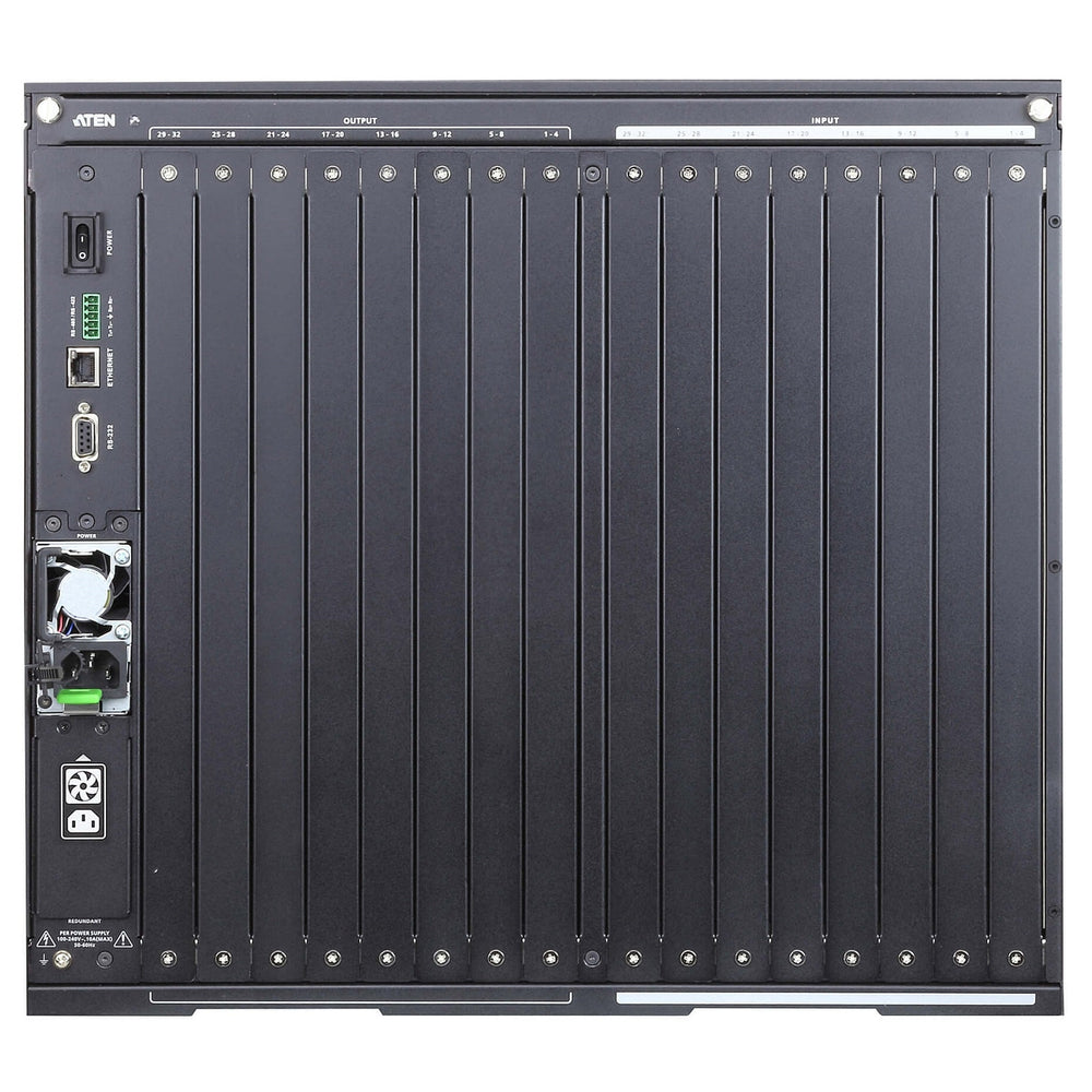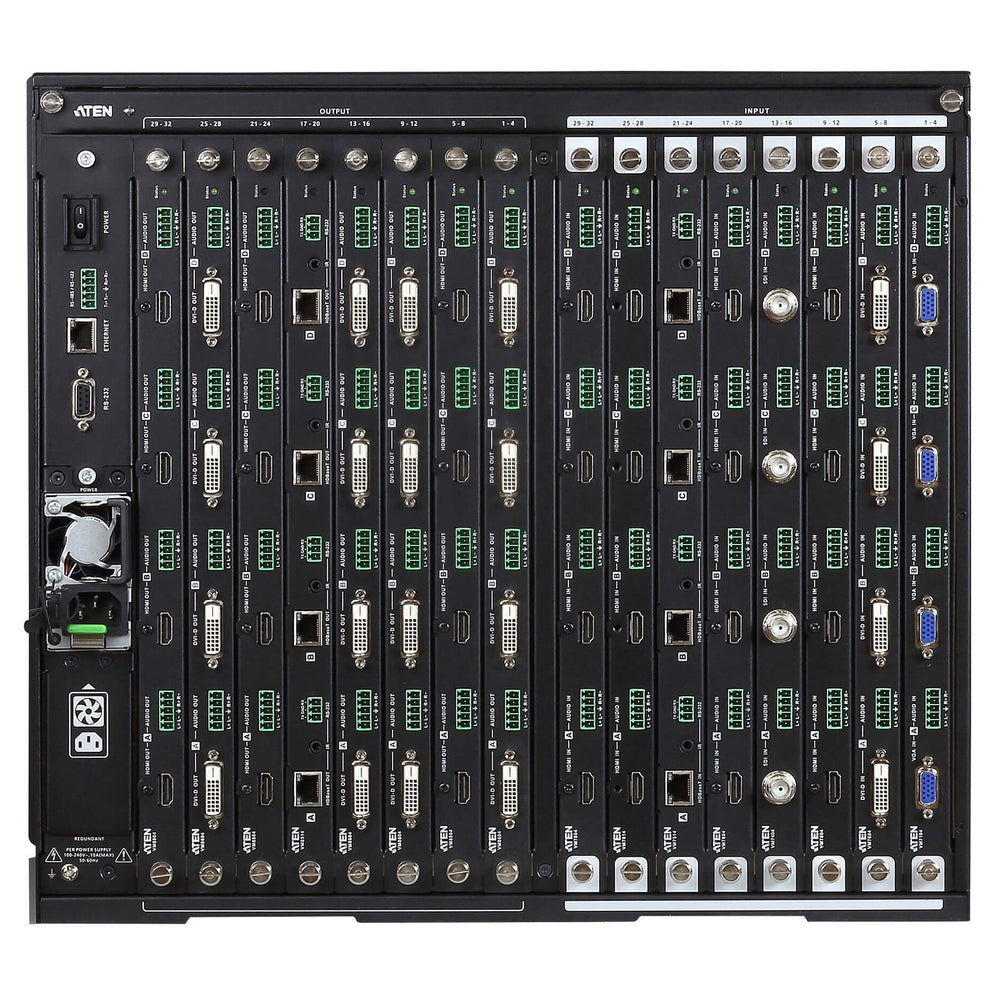 The VM3250 is expandable and supports hot-swappable ATEN I/O boards, providing automatic signal conversion for various digital and analog video interfaces like Fiber Optic, HDBaseT, DisplayPort, HDMI, DVI, 3G-SDI, and VGA. Its flexibility and scalability make it perfect for large-scale applications such as broadcasting stations, control rooms, emergency centers, and any setting requiring customizable, high-speed A/V signal routing.