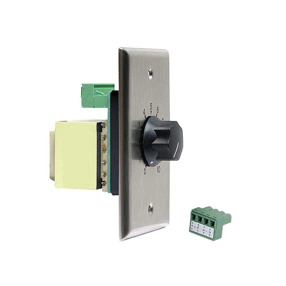 High-quality auto transformer AT100-PA provides the advantages of excellent frequency response, low insertion loss and reliable performance for volume control application in 25 and 70.7-volt systems. Attenuation is accomplished in ten make before break steps plus positive off position. (No stop between maximum and off position to prevent switch damage). Contacts are silver plated for noise-free operation. Features a removable terminal block. Includes stainless steel plate, with stamped and filled or screen printed dial scale and a skirted black knob.