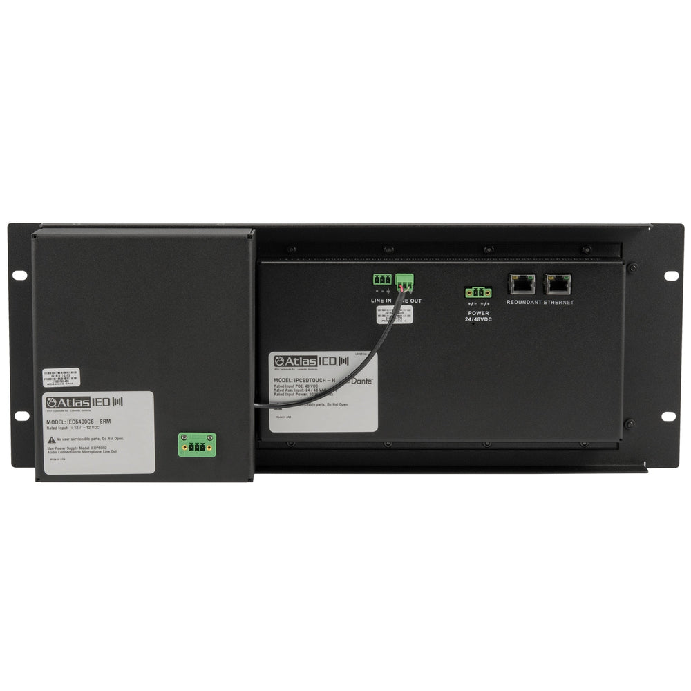 The 5400CS-SRM is a kit designed to mount a 5450CS, 5416CS, IPCSDTOUCH, or 550CS mic station into a standard 19” rack. It enables easy attachment of a self-powered speaker to the line output of these mic station models.