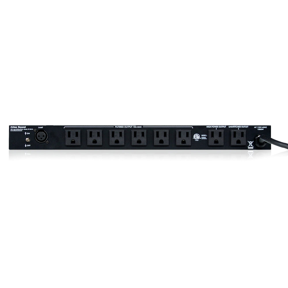 - Connectivity: AC mains in, 10 outlets (8 rear, 2 front), XLR lamp power