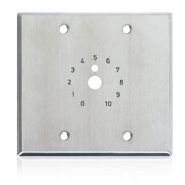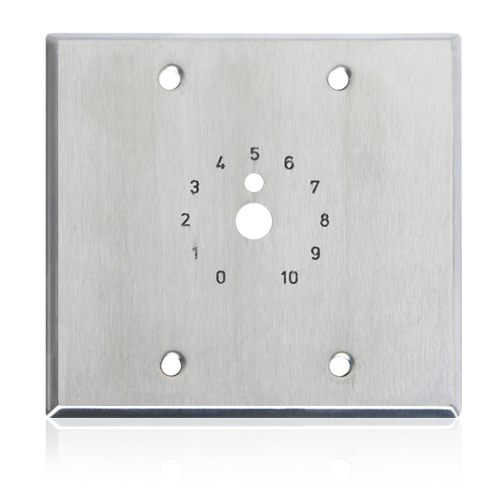 The AtlasIED HX25‑2 is a high‑quality double‑gang stainless steel faceplate designed for rotary volume or tone controls requiring a dial scale. It features a stamped and paint‑filled dial scale and mounts securely to a standard 3/8″ center hole in an electrical box.