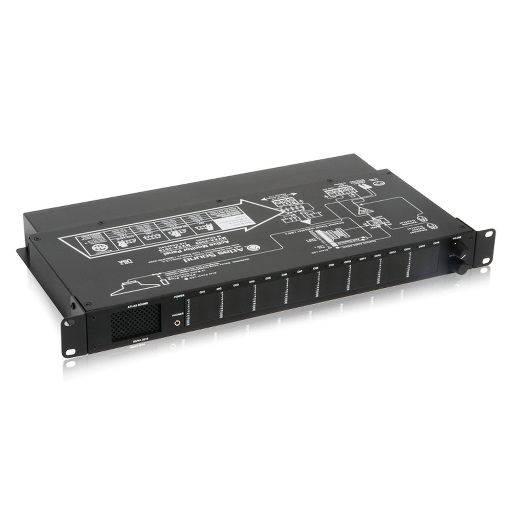Each channel provides a 12-segment LED bargraph with VU-style ballistics and peak indication, along with independent input-level jumpers. A built-in 3 W speaker, headphone output, line-level output, and external speaker output allow flexible audible monitoring. The slim chassis fits standard 19″ racks, backed by AtlasIED reliability.
