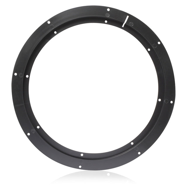 Notably easy to install: after cutting a 12″ (305 mm) hole in the ceiling, the ring snaps at its break‑slot and is maneuvered above the ceiling plane. It securely accommodates various 8″ baffle models and includes four J‑nuts for stable attachment.