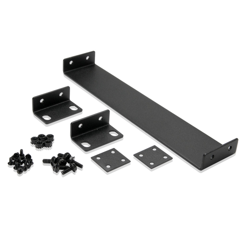 Constructed in a matching black finish, this kit includes all necessary hardware—rack ears, extension panels, joiner plates, and screws—for secure mounting and equalized front‑panel alignment. Ideal for integrating compact commercial audio amplifiers into full 19″ rack systems.