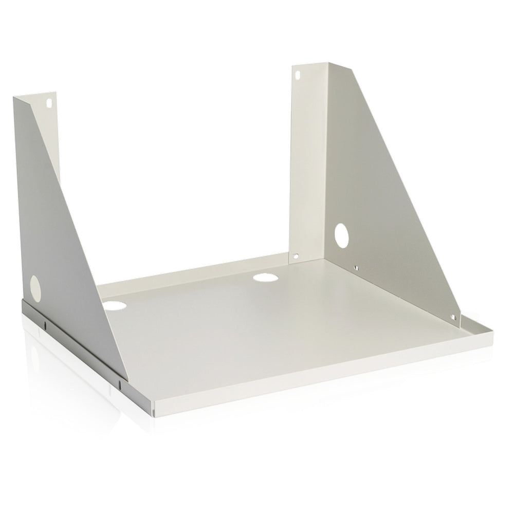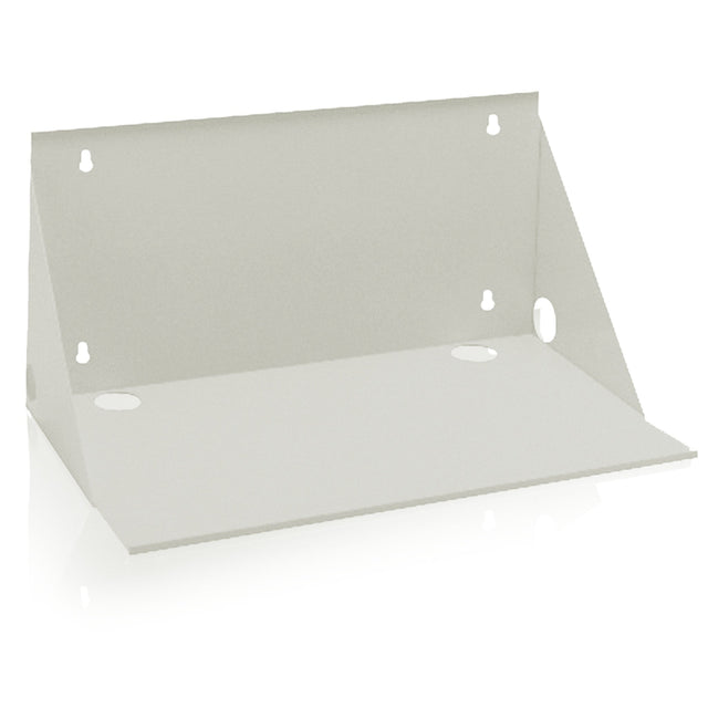 The AS-120-592 offers a compact design with a 10-Inch height and 12.5-Inch depth, while the versatile AS-140 shelf features a larger 12 3/8-Inch height and 17-Inch depth to accommodate larger or multiple devices. Both shelves mount securely to standard 16-Inch wall studs using keyhole slots and can be installed with equipment placed between side supports or inverted "bookshelf-style" for open access. The neutral white finish complements any installation environment.