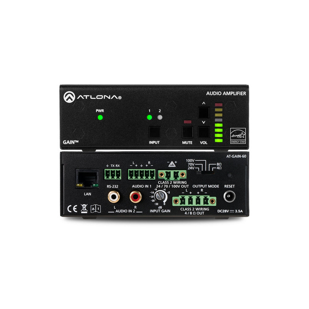 The Atlona Gain™ 60 (AT-GAIN-60) is a compact and efficient Class-D power amplifier designed for both low-impedance and high-impedance speaker installations. It offers flexible mode selection for either two channels of 30 W each at 4 Ω/8 Ω or one channel of 60 W at 24 V, 70 V, or 100 V. Ideal for meeting rooms, classrooms or plenum installations above drop ceilings, this amplifier delivers reliable sound and integration ease.