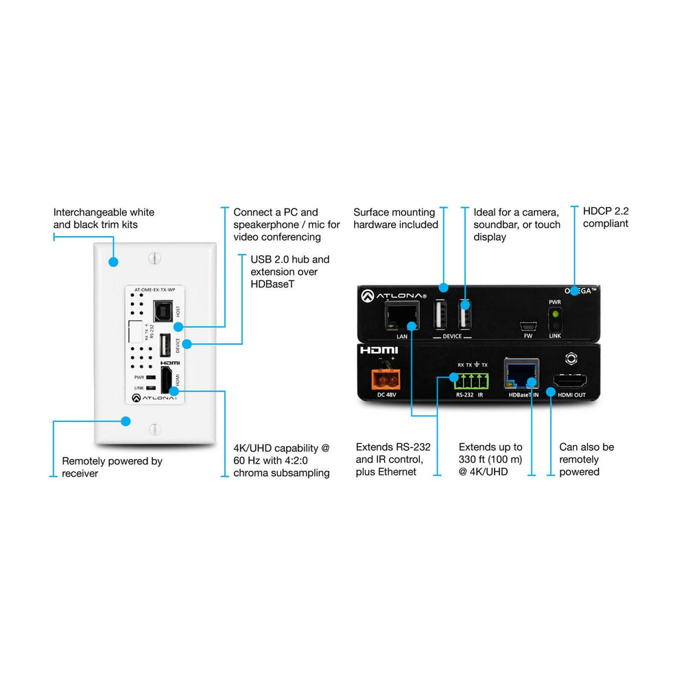 The Atlona AT-OME-EX-WP-KIT is a high-performance wallplate form AV extender kit designed for 4K/UHD video, embedded audio, USB, Ethernet, and control signal extension over long-distance category cable runs. It provides an efficient, integration-ready solution for conference rooms, classrooms, and collaborative workspaces.