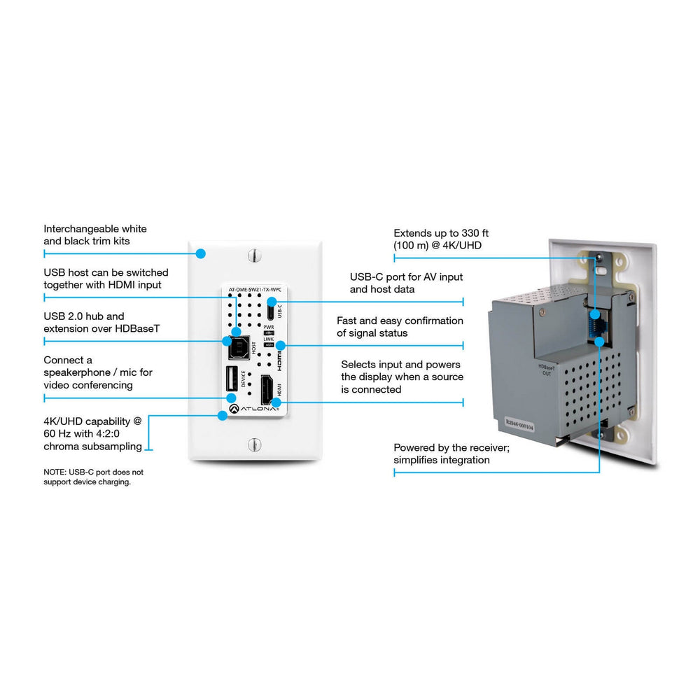 The Atlona AT-OME-SW21-TX-WPC is a compact 2×1 HDBaseT™ switcher and wallplate transmitter featuring USB-C® and HDMI® inputs. It transmits ultra-high-definition video up to 4K/60 4:2:0, embedded audio, USB, Ethernet, and control signals up to 330 feet (100 meters) over a single category cable. Designed for clean integration in modern AV environments, the OME-SW21-TX-WPC fits a standard US one-gang wallplate and includes interchangeable black and white trim kits.