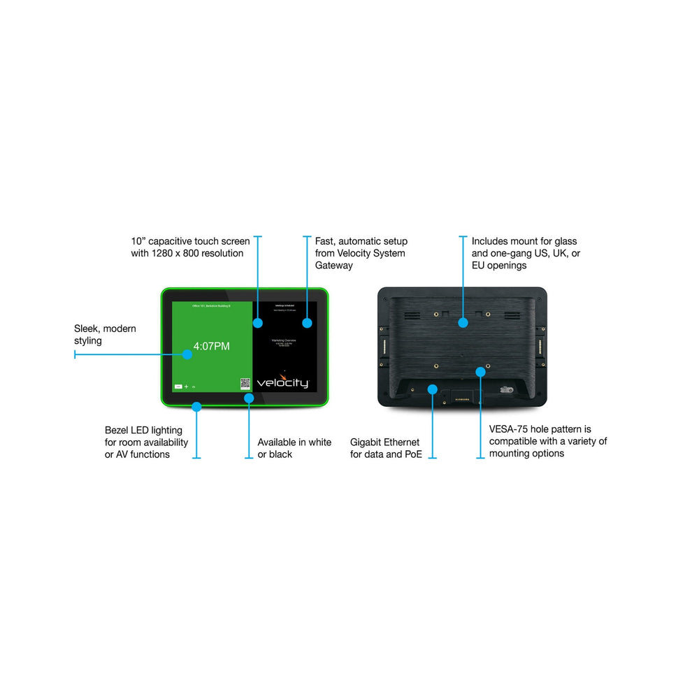 - 10″ Velocity™ touch panel for AV control and room scheduling