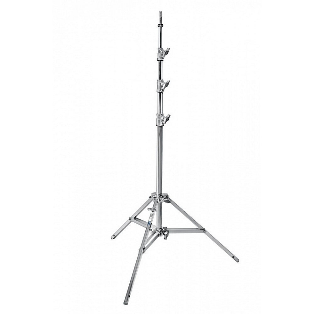 This is a chrome plated steel stand with 4 sections and 3 risers. The stand can hold a maximum payload of 10kg and can reach a maximum height of 3m. The stand has 1 leveling leg for easy use on uneven surfaces. It features a 5/8” (16mm) top attachment.