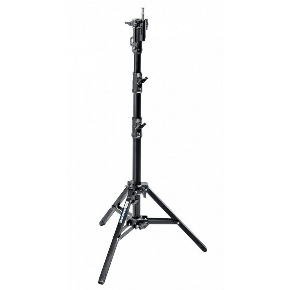 Avenger Combo Stand 20 is a black aluminum stand with 3 sections and 2 risers. It's a heavy duty stand that can support a payload up to 25kg and can reach a maximum height of 1.98m. It is also compatible with A900NB braked wheels which are sold separately. It has a 5/8” (16mm) male stud top attachment and a 1”1/8 (28mm) female receiver. It also features 1 leveling leg to keep the stand steady on uneven surfaces.