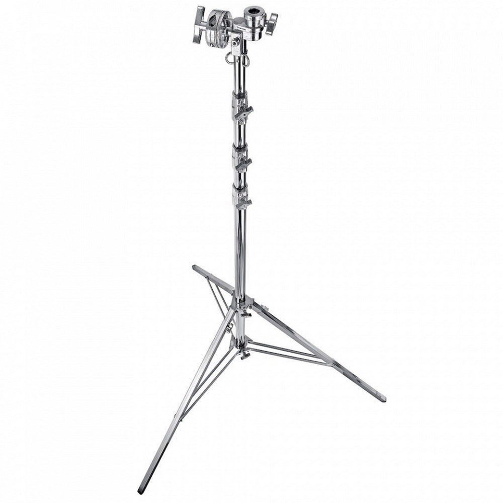These overhead stands have been designed with a built-in grip head for supporting poles, tubes and overhead frames. This chrome steel stand has 5 sections and 4 risers. It features 2 leveling legs for use on uneven terrain. This stand can support a maximum payload of 30kg and can reach a maximum height of 6.38m.