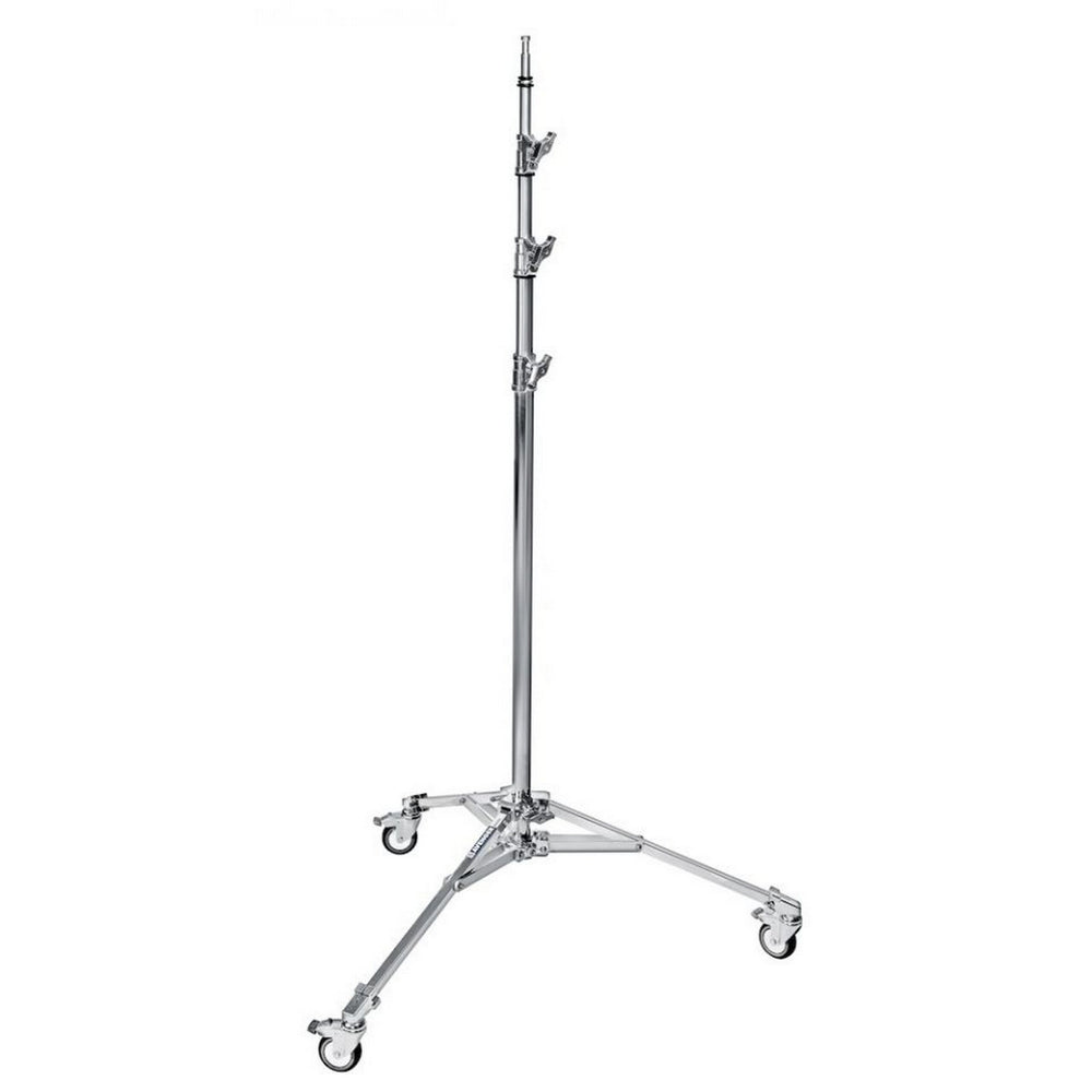 This Avenger roller stand with 4 sections and 3 risers features steel legs and column, and risers in aluminum. It can support a payload up to 12kg and can reach a maximum height of 4.30m. It features wheels for easy transportation and a low base for extra stability.