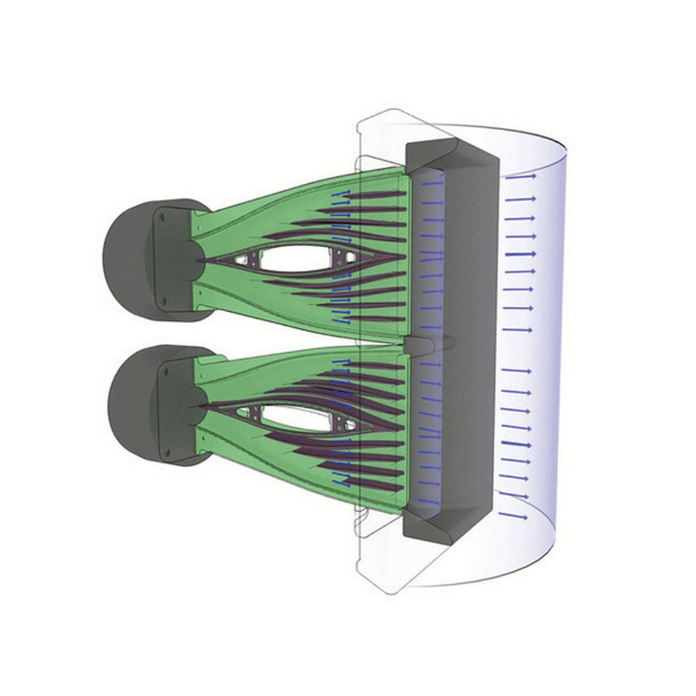 The high frequency range is reproduced by two low-distortion compression drivers, equipped with very light-weight diaphragms. Two transmission line wave forming waveguides have been used to load the HF drivers, in order to provide a detailed and natural sound and to achieve a long-distance HF projecting capacity. The two 10” woofers employed in the reproduction of the mid-bass range are equipped with very light-weight cones. The lightness of the diaphragm is furthermore improved by the use of aluminum voice coil instead of conventional copper. This ensures a fast reproduction of the mid-range and of mid-bass musical passages, improving also the thermal capacity of the voice coil and, consequently, controlling the overall power compression. The two 10” woofers are back loaded by a short hybrid transmission line that minimizes the effect of the box resonances and eliminates the “boxy” mid-bass sound commonly obtained from regular bass reflex enclosures.