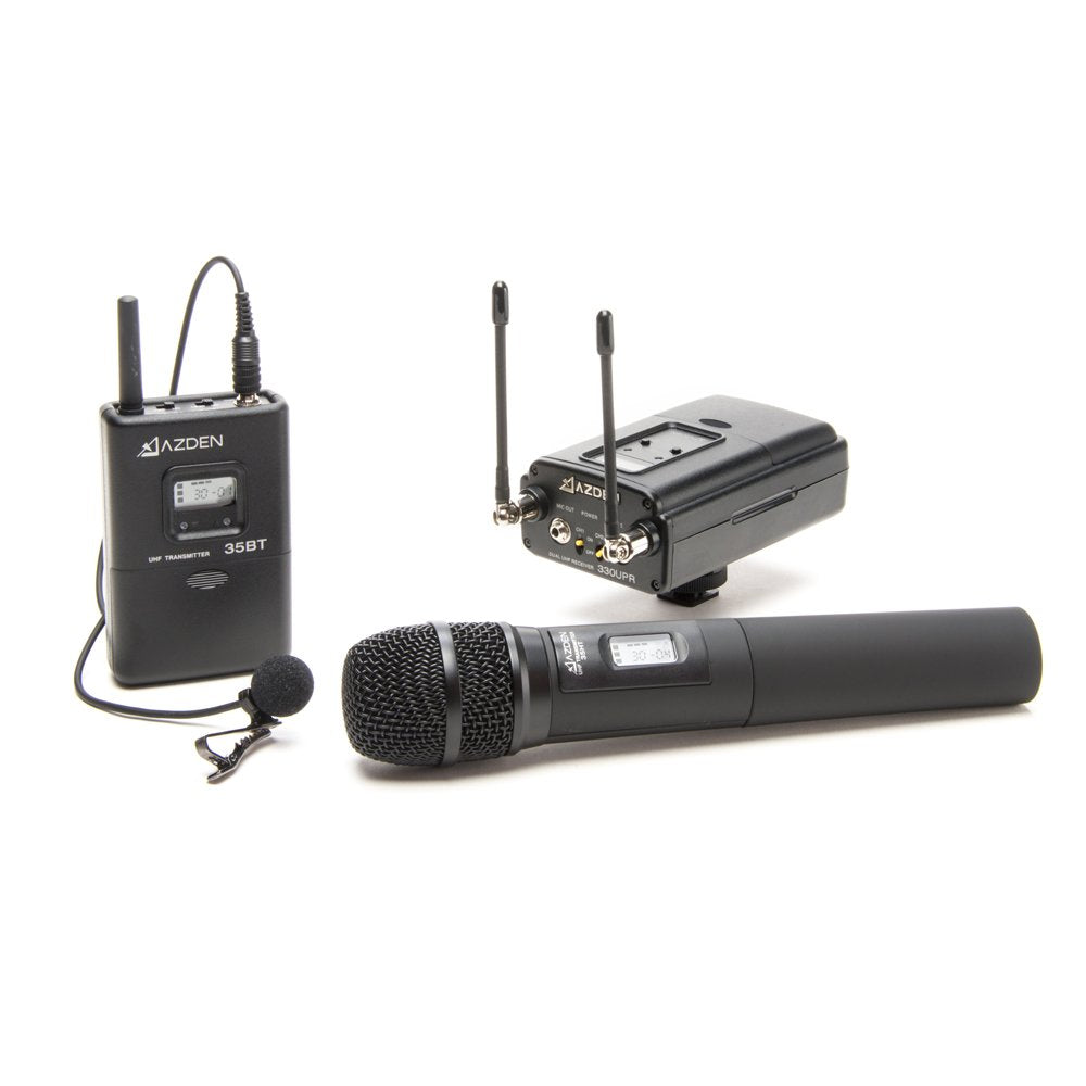 The Azden 330LH UHF dual wireless system is a powerful dual-channel UHF wireless microphone system for camera-mount applications. The system consists of an Azden 35BT body-pack transmitters, EX-503L lavalier microphone, 35HT handheld microphone/transmitter and the 330UPR portable dual-channel receiver. The inclusion of both the body-pack and handheld transmitters allows users to the flexibility to use the right microphones for the right job.
