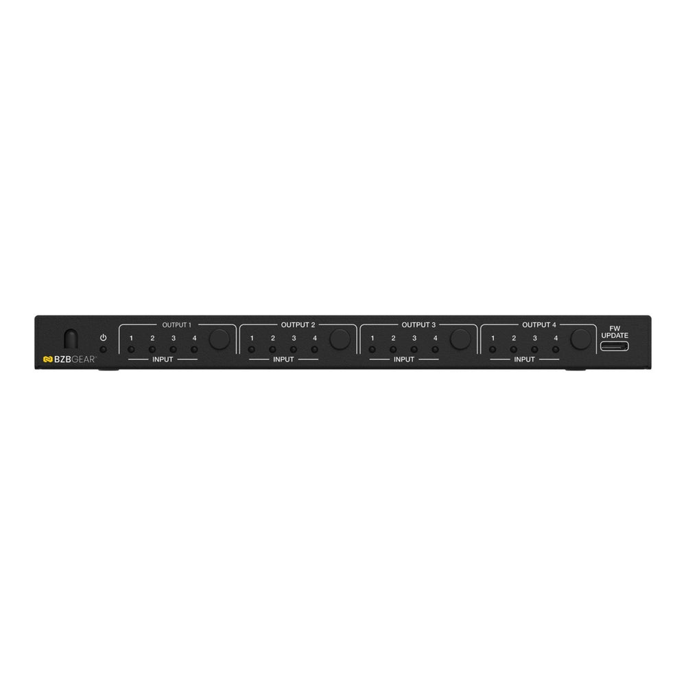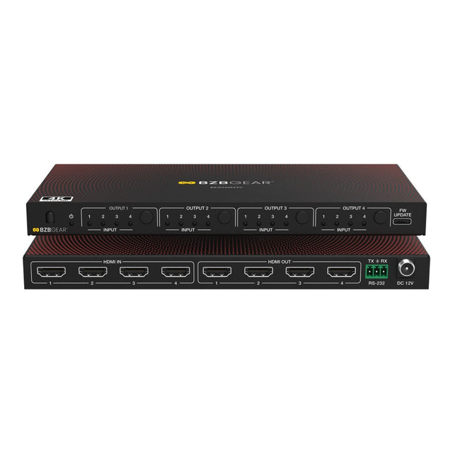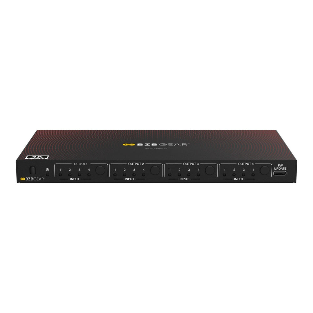 The BZBGEAR BG-MVS4X4-CV is a professional-grade 4x4 HDMI seamless matrix switcher and video wall processor designed for commercial AV environments requiring flexible signal routing, real-time switching, and advanced display control. Supporting up to 4K UHD resolution at 30Hz, this compact yet powerful unit enables seamless HDMI switching without signal interruption, making it ideal for control rooms, digital signage, conference spaces, and broadcast applications.