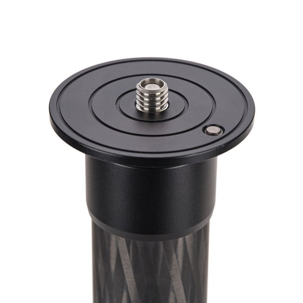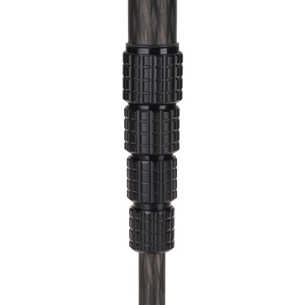 This monopod combines twist locks with a CNC-machined aluminum flip lock, allowing rapid extension and precise height fine-tuning. The rotating foot uses a stainless steel conical ball bearing to enable smooth panning movements without lifting the monopod.