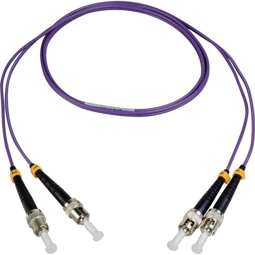 Duplex ST to ST OM4 multimode fiber optic patch cables connect patch panels or network devices requiring 50/125 multimode cables for higher bandwidths and longer distances. Designed for 10, 40, and 100 Gigabit applications, cost-effective OM4 cables are backwards compatible with existing OM3 systems. Purple cable is terminated with durable ceramic ferrule connectors.