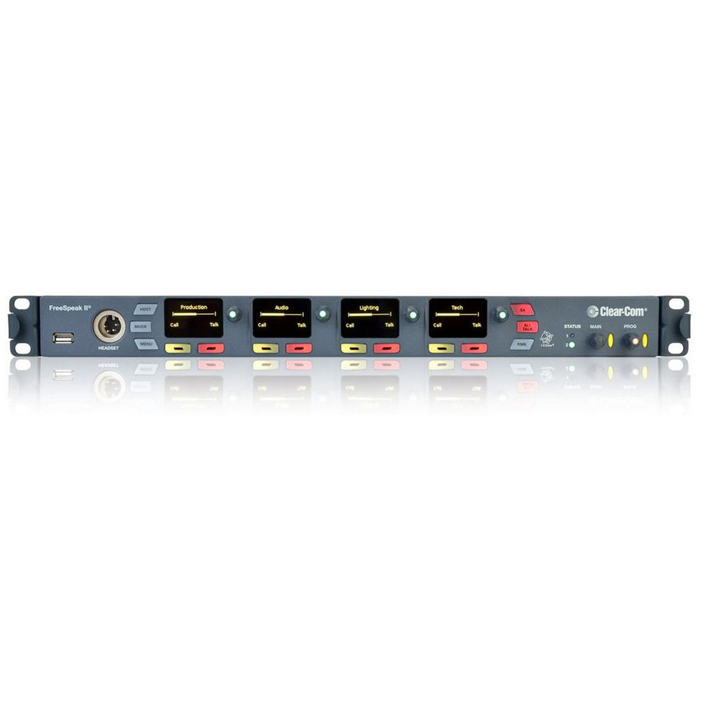 The FSII-BASE-II is a base station for the wireless FreeSpeak II 1.9GHz and 2.4GHz active transceiver and beltpacks with four 2-wire analog partyline connections, four 4-wire audio connections and four digital displays with soft keys. The base station can operate a mix of up to 25 1.9GHz and/or 2.4 GHz beltpacks on a single system. The base station can be used in Main Station mode with Talk and Call soft keys or as a Headset Station for communication and monitoring from the panel.The base station's digital displays allow easy system configuration directly from the base station or through the browser-based Core Configuration Manager tool.