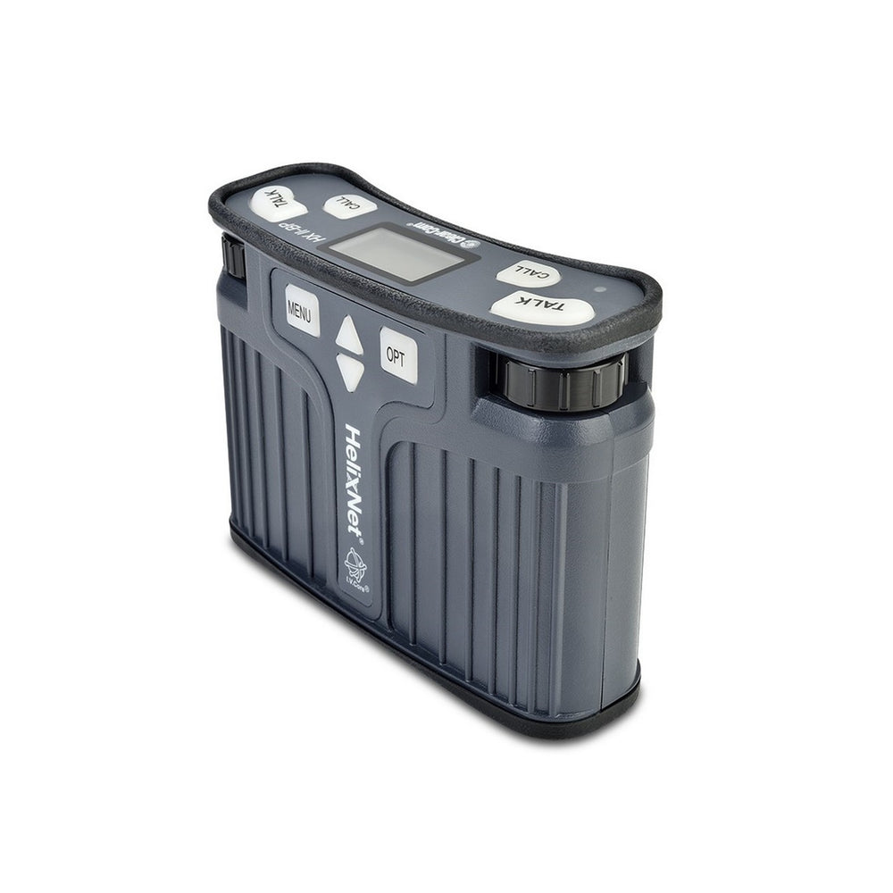 HelixNet digital two-channel dual listen monaural beltpack with a high-contrast OLED display and four-pin male headset connector. It has a three-pin female XLR for Digital PL and an RJ-45 etherCON PoE intercom line connector.