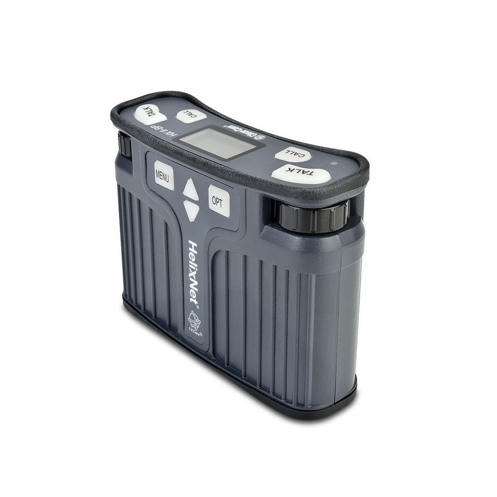 HelixNet digital two-channel dual listen monaural beltpack with a high-contrast OLED display and five-pin female headset connector. It has a three-pin female XLR for Digital PL and an RJ-45 etherCON PoE intercom line connector.