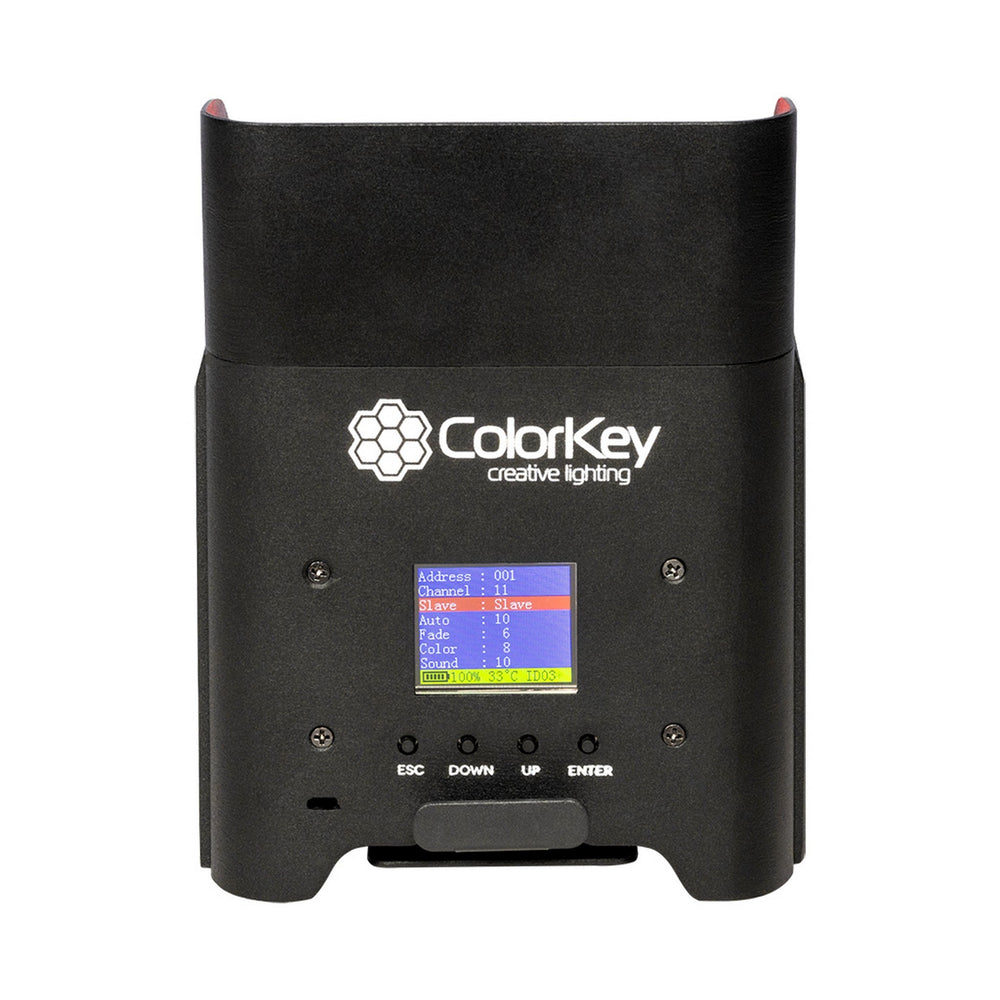The ColorKey AirPar HEX 4 Wireless Battery-Powered Uplight offers a variety of control options to suit your needs. The built-in transceiver allows you to wirelessly control other fixtures in Master/Slave mode, perfect for synchronized lighting effects. The vivid OLED menu display provides intuitive access to presets, color mixing, and on-the-fly speed adjustments for all Air Series fixtures. For a more traditional approach, the AirPar HEX 4 also includes a handy IR remote for control on the go. And if you require complex lighting setups, the 3-pin DMX ports allow connection to DMX controllers.