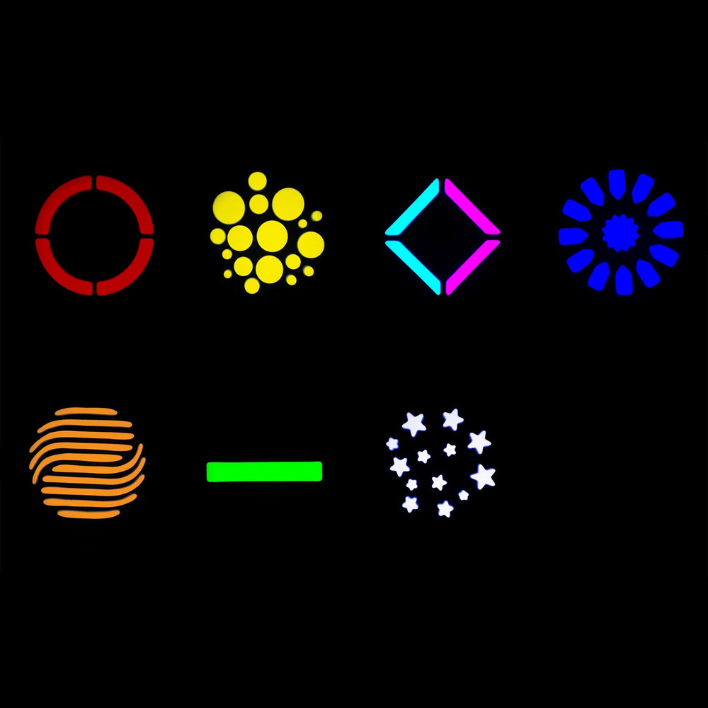 - Combine gobos to  create captivating visual effects with a wide range of intricate patterns and  designs, perfect for any event or environment. The Gobo Shake feature adds an  extra layer of depth to your show.