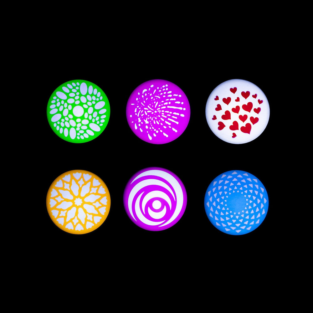 - Unleash your creativity with a selection of 7 Static Metal Gobos and 6 Rotating Glass Gobos, along with 2 open spots.