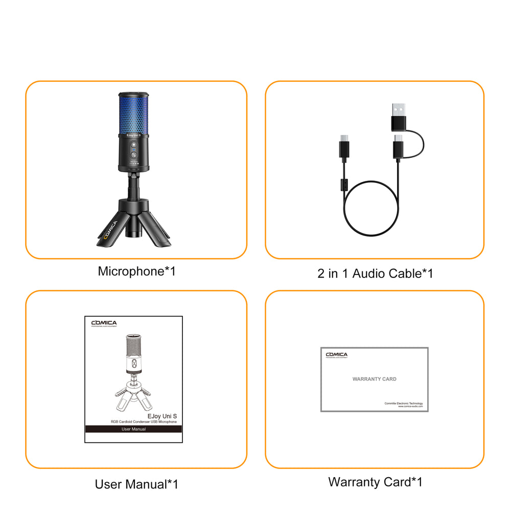 The Comica EJoy Uni S RGB USB microphone delivers professional 48kHz/24-bit studio recording quality in a sleek and portable design. Built with a cardioid polar pattern, it ensures focused sound capture from the front while reducing background noise, making it ideal for streaming, podcasting, gaming, and online meetings.